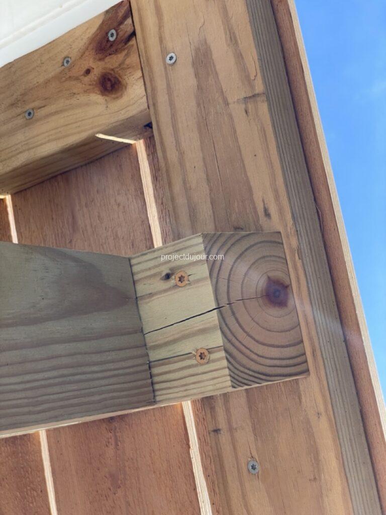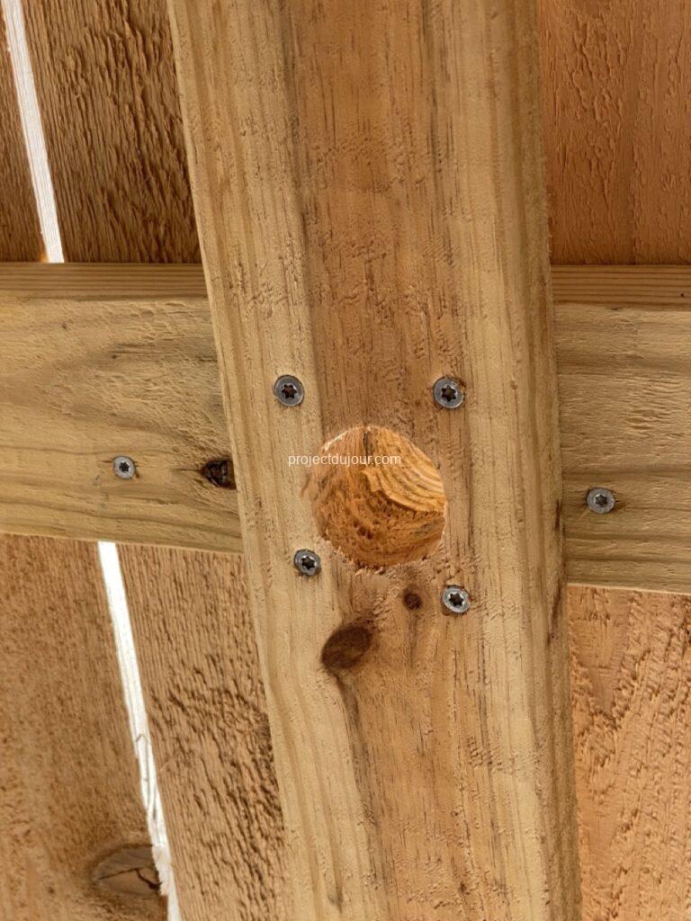 The table top is made of 1×6 cedar boards. The overall size is 72″ x 34 1/4″. I used 3 12 feet long 1×6 cedar boards cut in half for this build. The cedar boards are screwed to the top frame from under so the screws are hidden.