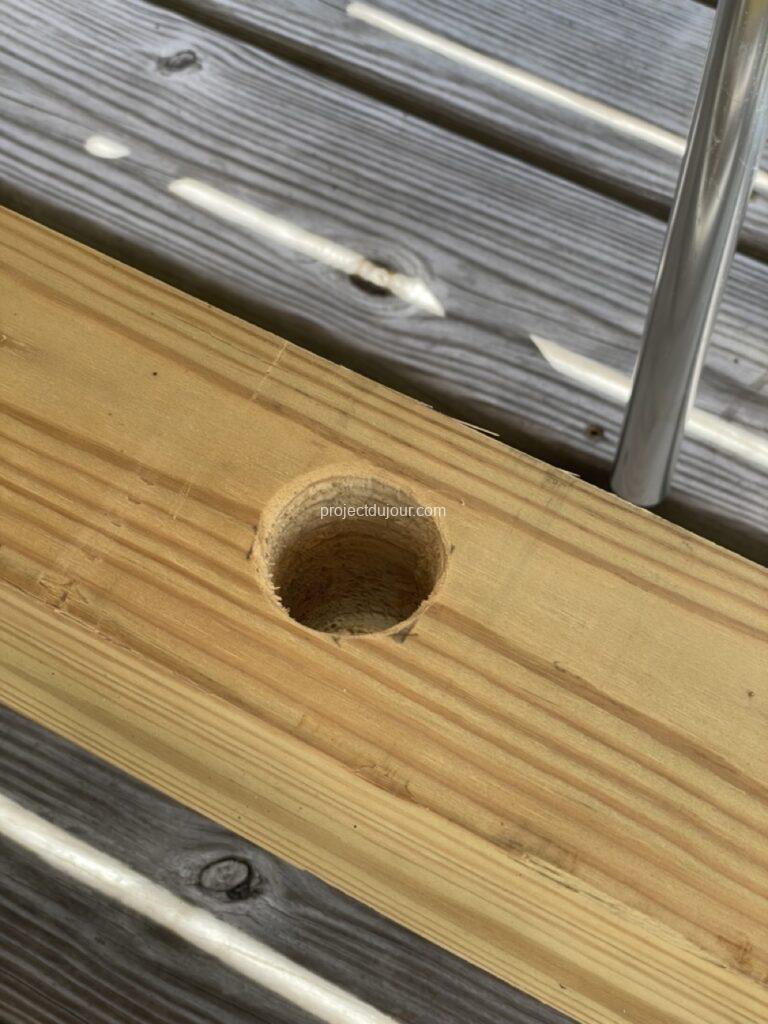 After everything was put together, I drilled a 1 5/8″ hole in the middle of the table top as well as the H stretcher to hold an umbrella.
